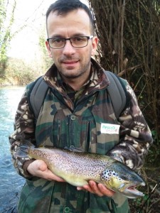 L’inizio non è stato entusiasmante, subito qualche liscio, ma dopo qualche mese di inattività ci può stare…Poi inizio a spostarmi a sondare varie buche del fiume, a cercare di tirare fuori una trota magari da sotto un ramo sommerso o dietro qualche sasso ed arrivano le prime catture, due trote di 30 cm e un paio più piccoline alle quali ho dato subito la giusta libertà. Poi arrivo su uno dei posti da me preferiti, era difficile da raggiungere per via dei rovi, ma non potevo non pescarci. Con molta calma e molti graffi alle mani (quanto bruciano!!!) sono arrivato sulla riva del fiume, lancio il mio Martin e durante il recupero vedo arrivare un’ombra che in meno di un secondo lo afferra e torna verso il centro del fiume… Mamma che emozione!!! Metto subito alla prova la mia canna e riesco a tirarla dove l’acqua è un po’ più calma, ma non ne voleva proprio sapere di arrendersi, tenta di tornare verso il centro ma con l’aiuto della canna e con la frizione del mulinello la riporto verso di me… Ma niente, non ne vuole sapere!!! Una bella lotta, ma alla fine ho vinto io ed ho preso quella che è stata la mia più bella cattura su questo fiume, una trota fario da 1,8 kg.