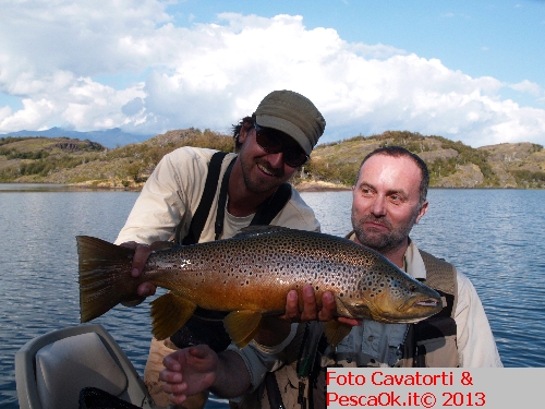 Affascinati da questo ambiente arriviamo in poco tempo al lago Azul, poi un altro breve tratto per fermarci al lago Desierto dove ancoriamo la barca in pieno sole. Non c’è un alito di vento e la superficie del lago è un vetro color turchese, due oche si alzano in volo e l’ultima foto le cattura mentre specchiano il loro sincrono volo sulla superficie dell’acqua. Fin dai primi lanci le catture sono molto soddisfacenti, tutte brown di generose dimensioni e magnificamente colorate che salgono lentamente sulle nostre imitazioni in foam lanciate a ridosso dei massi e dei tronchi sommersi.