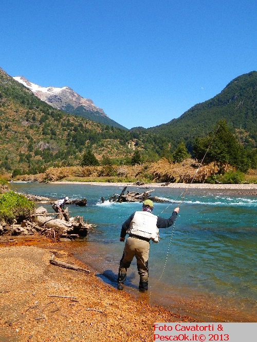 Dopo circa due ore scendiamo nel Lago Azul e peschiamo cacciando a vista nei sottoriva: è una grande emozione vedere la trota che si avvicina lentamente, quasi sospettosa, alla mosca, un attimo interminabile di tensione dove trattengo il respiro mentre il cuore accelera i battiti in attesa di vedere la bocca spalancata ghermire l’artificiale. Il tratto di fiume che unisce i due laghi è molto breve ma è un angolo di Paradiso al quale dedichiamo il resto della giornata. Mentre il nostro gillie prepara carne e verdure alla griglia risaliamo pescando nei fili di corrente, nelle piane, dietro i massi e soprattutto a ridosso dei tronchi sommersi che rappresentano le tane delle trote più grosse. Le catture da oltre 50 cm sono comuni ed è entusiasmante vedere trote di queste dimensioni che salgono in superficie per poi inabissarsi e combattere con forza mettendo a rischio, ogni volta, la rottura del pur robusto finale. Un’ultima foto seduto sulla sponda del fiume dove il lago finisce ed il fiume inizia la sua corsa, tutt’intorno picchi innevati e ghiacciai luccicanti e, mentre il sole è ormai volto al tramonto, Nerio cattura l’ultima trota.