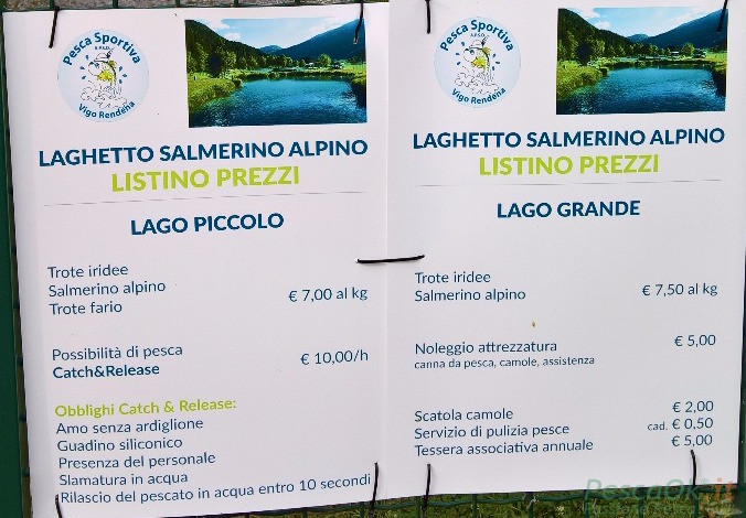 Ho avuto il piacere di pescare nel laghetto “Lago Salmerino alpino” a Vigo Rendena, che è formato da due laghi, uno grande ed uno piccolo. Nel piccolo ci sono i pesci grossi, trote sopra il kg, infatti come potete vedere dalla foto noi abbiamo preso una bella big. Nel laghetto piccolo ci sono invece trote che arrivano fino ai 28/30 cm e ci si diverte molto vista la loro abbondanza. Quindi non avete che l’imbarazzo della scelta. Nel laghetto, oltre a fario ed iridee, trovate anche salmerini di fonte. Per regolamento e prezzi vi rimando alla foto in basso nella gallery.