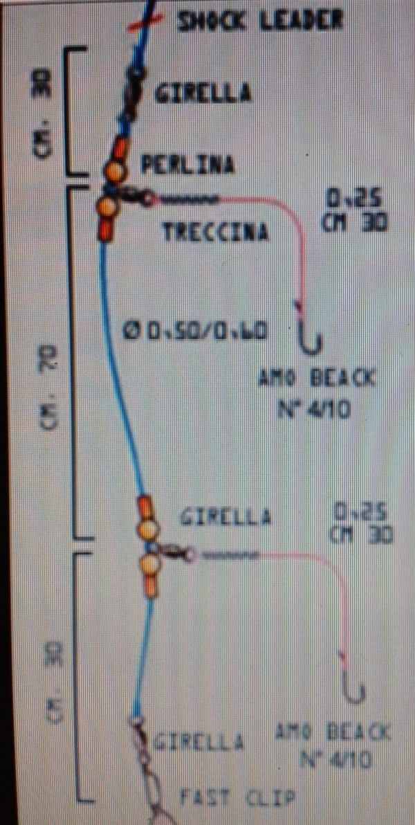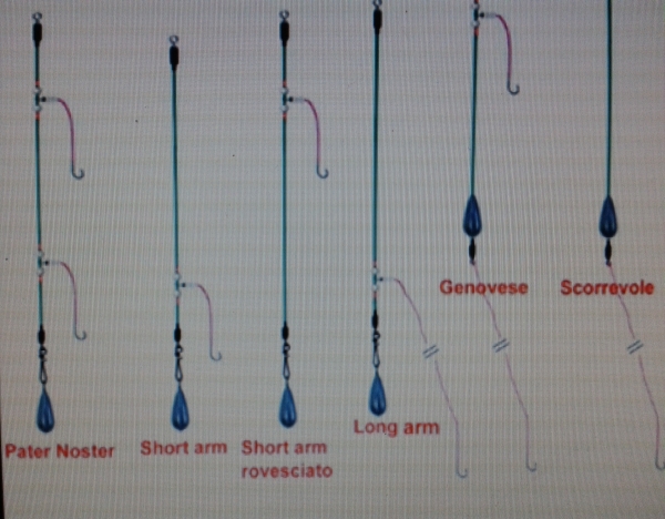 E’ piuttosto semplice da realizzare: al filo del mulinello andremo a legare lo shock leader, dove inseriremo poi in sequenza una perlina, una girella (meglio se tripla ed a barilotto) ed un’altra perlina….alla fine metteremo il piombo. Le perline possono essere bloccate con della colla apposita che si trova in commercio e si dovranno trovare a circa 7-8 cm l’una dall’altra. Alla nostra girella andremo ad applicare il nostro terminale la cui lunghezza varierà in base alle condizioni del mare. Con un mare abbastanza calmo io uso dei terminali che vanno da 1,8 a 2,2 mt, per rendere il movimento della nostra esca più naturale possibile, ma se le condizioni del mare dovessero peggiorare, si può ridurre la lunghezza ed aumentare  il diametro del finale. Ovviamente si possono costruire anche montature con più ami come rappresentato in figura.